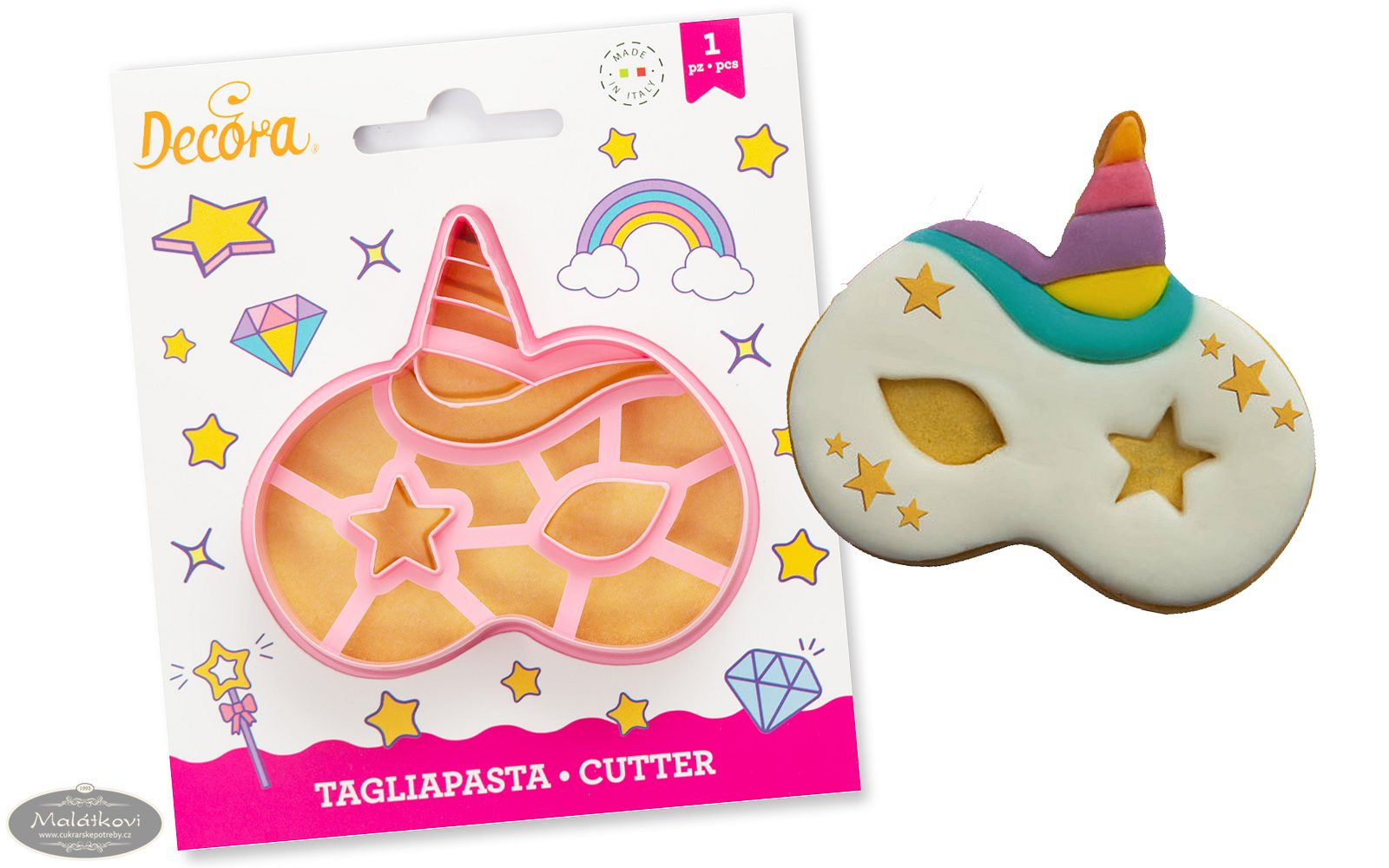 Použijte vykrajovátko ve tvaru masky jednorožce a vytvořte lahodné a voňavé tvary cukroví a perníčků nebo cukrových hmot a marcipánů na dorty a sladkostí.