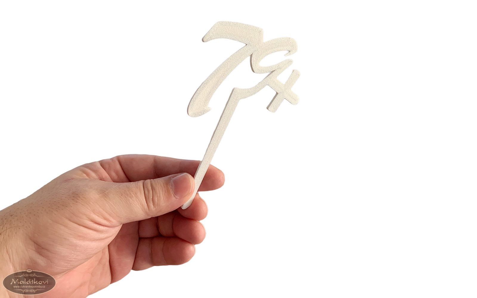 Zápich na dort v podobě nápisu 79+ bylo vytištěno malosériově na 3D tiskárně. Před použitím doporučujeme omýt ve vlažné vodě se saponátem.