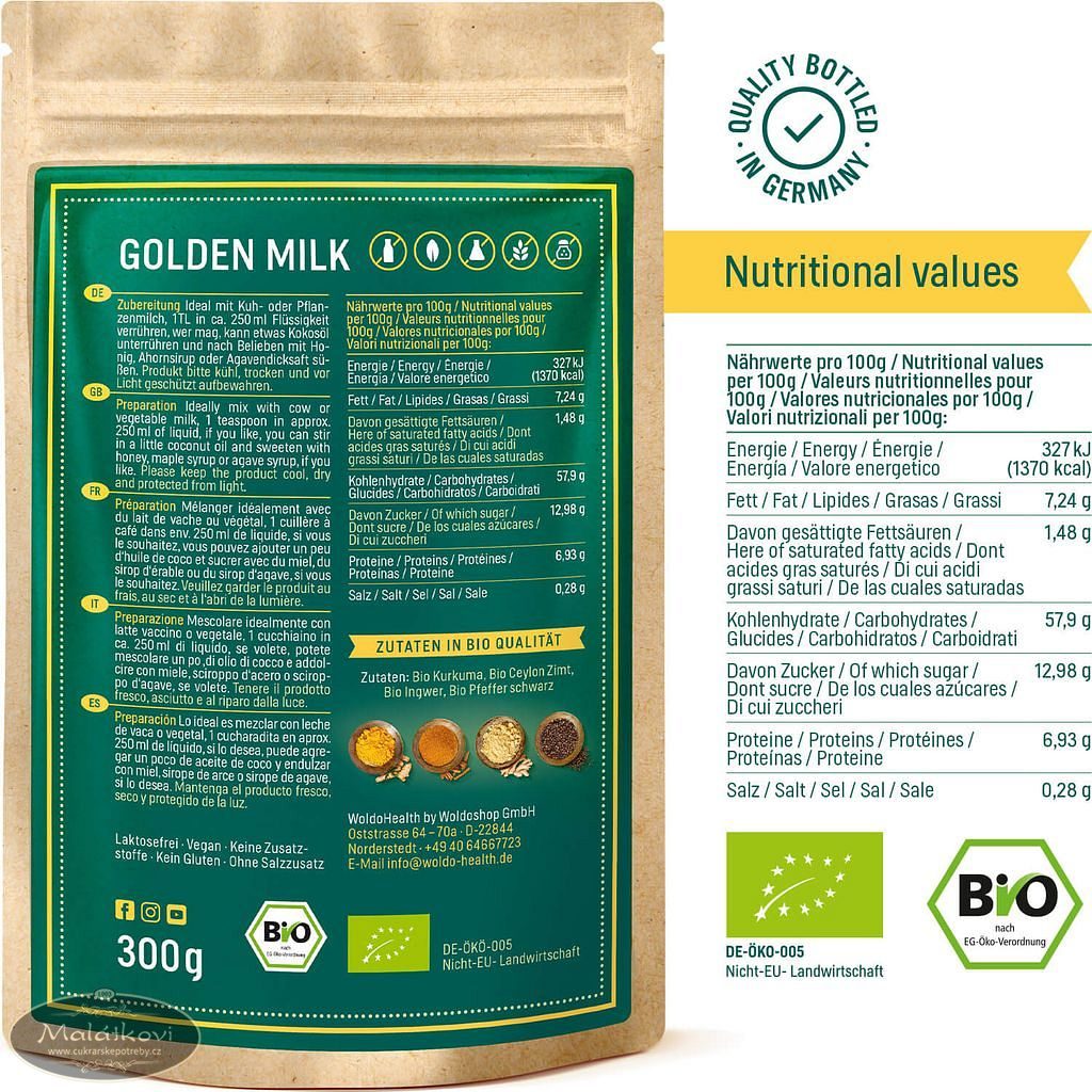 Zlaté mléko je tradiční ajurvédský nápoj ze směsi kurkumy, zázvoru, skořice a černého pepře v organické kvalitě.