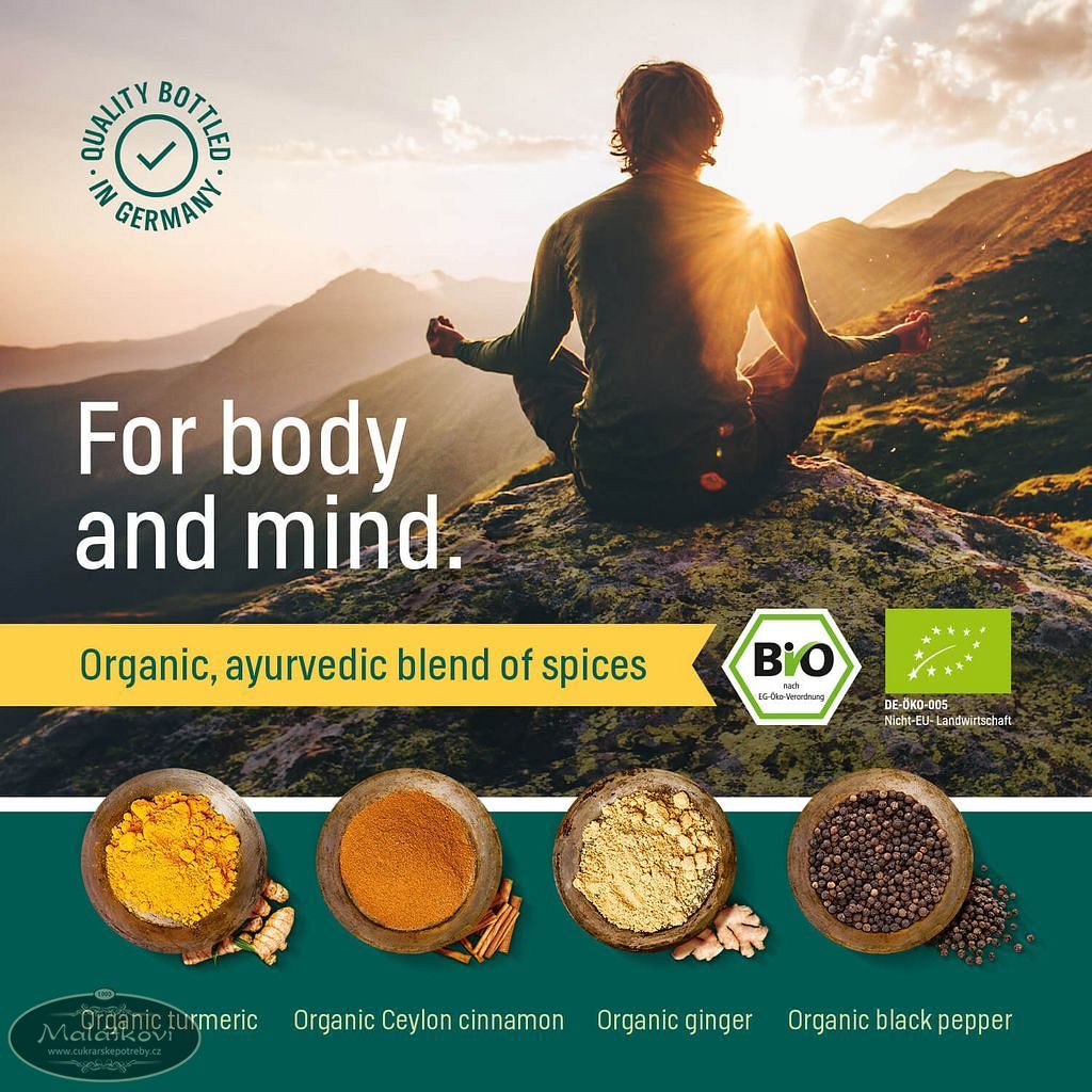 Tato pečlivě vybraná směs kurkumy, zázvoru, cejlonské skořice a černého pepře v bio kvalitě je namíchána přesně podle ajurvédské receptury pro maximální účinnost i chuť. Černý pepř zde plní důležitou roli – až tisícinásobně zvyšuje účinnost kurkuminu, hlavní účinné látky kurkumy. Díky tomu je zlaté mléko skutečným elixírem pro vaše tělo i mysl.